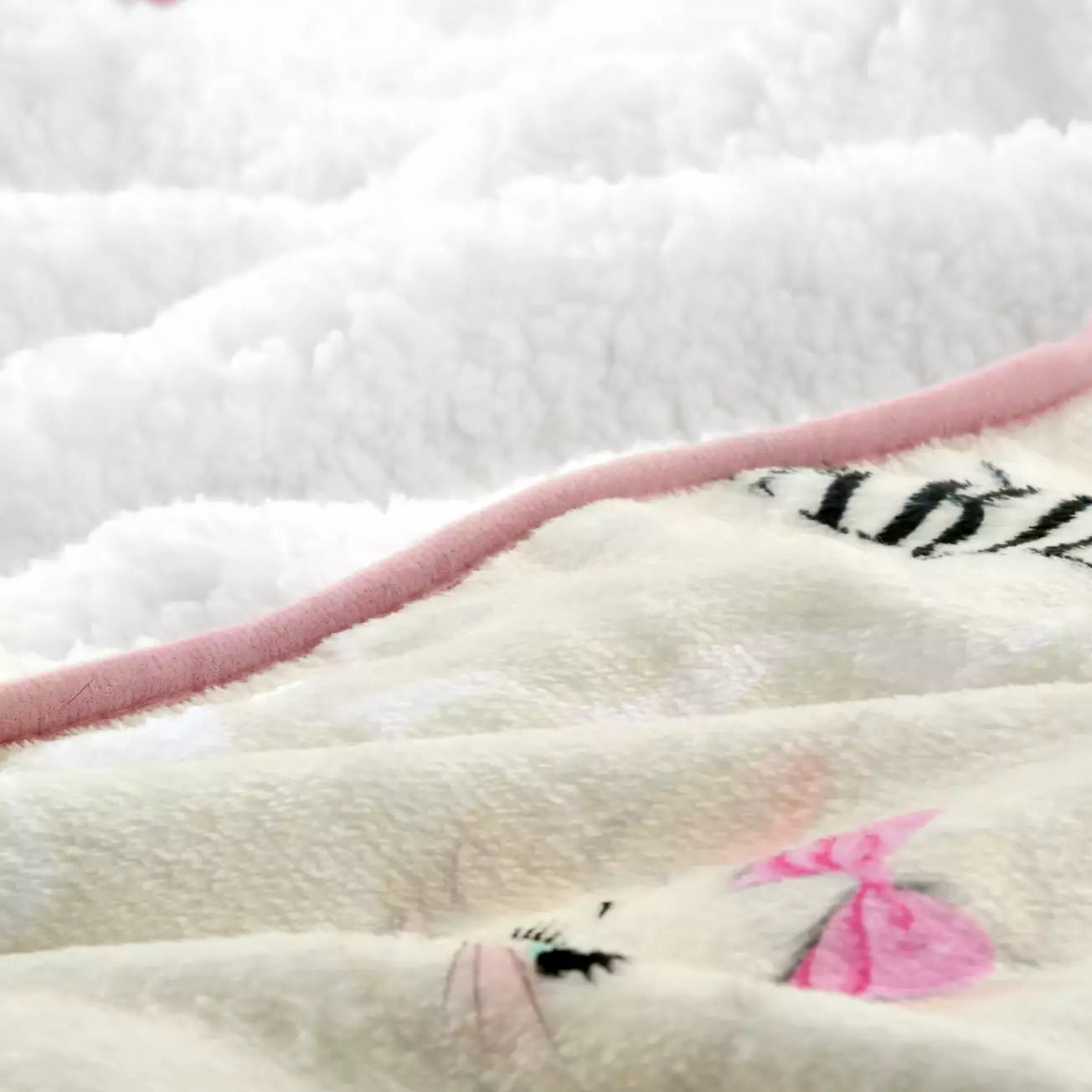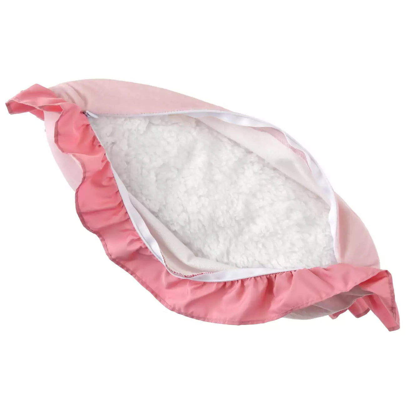To celebrate the 55th anniversary of "The Aristocats," we're introducing a 2-way blanket that can also be used as a cushion. The center of the cushion features Marie, a kitten with a keen interest in fashion. She approaches a pair of black mules to try them on, but is distracted by the ribbon and ends up playing with them. This adorable story is printed on the center of the cushion. The muted pink color makes it a perfect accent piece for any room. Inside the ruffled cover is a large, all-over print blanket. The vintage-inspired Marie art adds a stylish touch. The back is made of plain boa fabric. Its generous size and thickness make it extra warm!