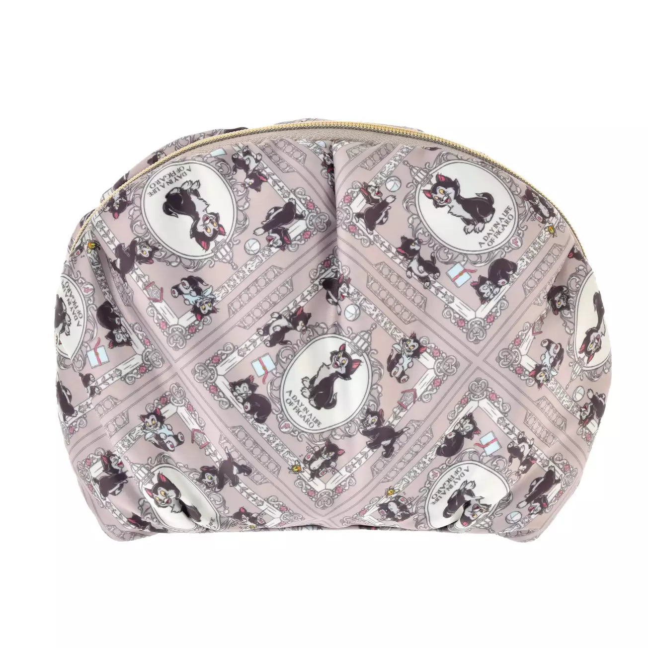 Figaro-design all-over print pouch. This item features Figaro, the cat owned by Geppetto, the grandfather who created the puppet Pinocchio. The plump, rounded pouch features a full-surface print of Figaro in various poses. Based on Figaro's daily life, this art is filled with expressive, energetic gestures. Figaro's goldfish, Cleo, is an essential part of his daily life. Be sure to check out the adorable design of the two cats! The subdued color scheme makes it suitable for both work and play. The gusset provides ample storage space.