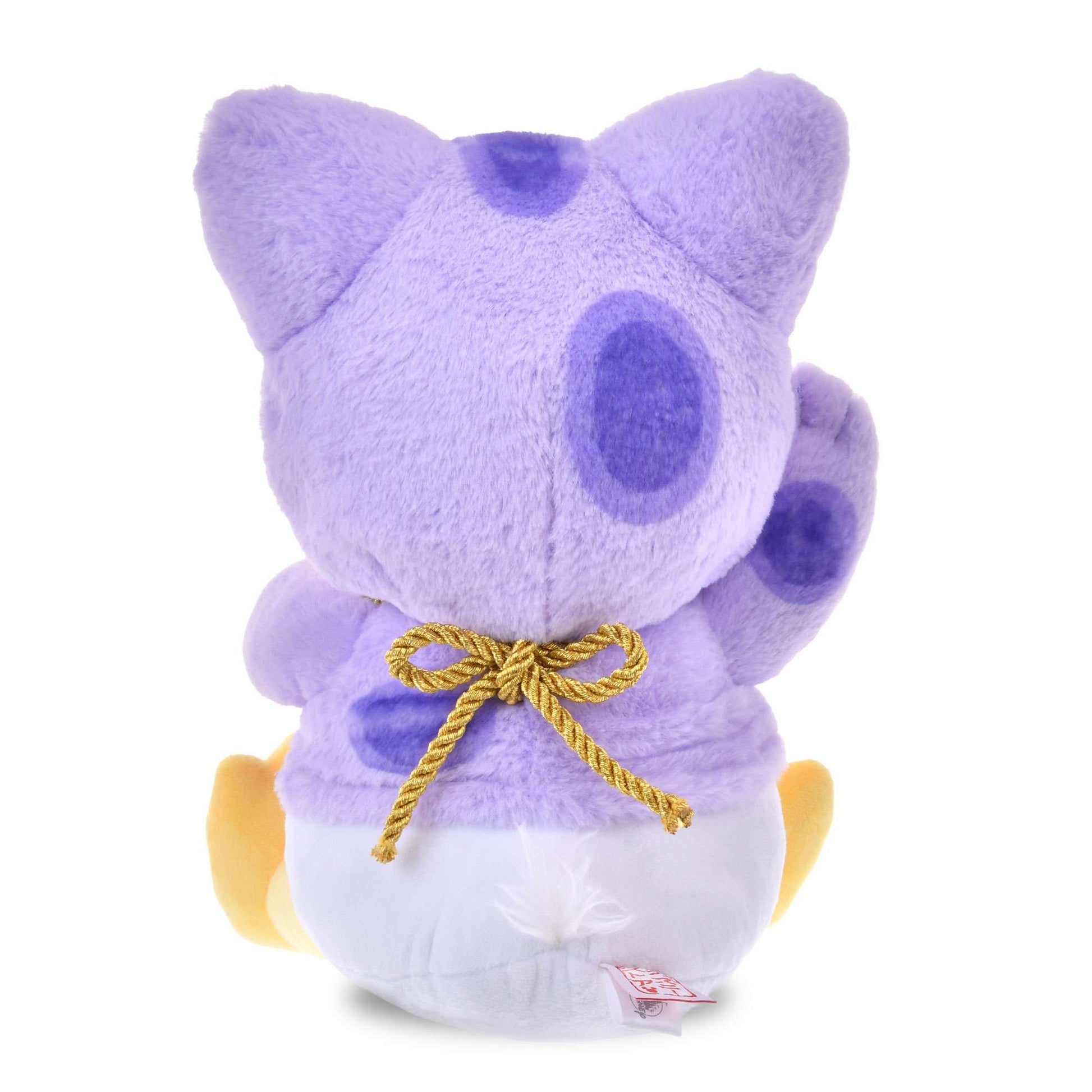Welcome the New Year with a Japanese-inspired cat-inspired style. This Donald plush toy is inspired by the colors of spring in Japan. Dressed in a traditional Japanese white-violet cat costume, Donald is adorable and fresh. He wears a violet-patterned apron and a golden bell. His adorable pose with his paw raised as if in greeting is adorable, and his cute pink paws are on full display for a truly soothing experience. In his other hand, he holds a gourd mascot. The hood on the cat costume is also great to remove. Enjoy displaying this in your favorite space, such as your entryway or living room.
