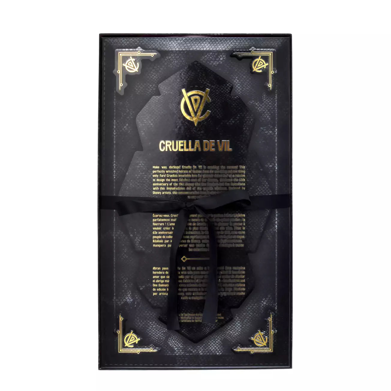 To celebrate the 65th anniversary of the animated film "101 Dalmatians," a Cruella de Vil doll has been released. The Disney villain Cruella is striking with her trademark black-and-white hair, bright red lipstick, and unique long coat. Her leather-like dress features an embroidered Cruella de Vil monogram at the hem. The coat's lining and accessories add a touch of dazzling sparkle. Experience this fashionable villain up close! Presented in a luxurious box, this is a must-have item for fans.