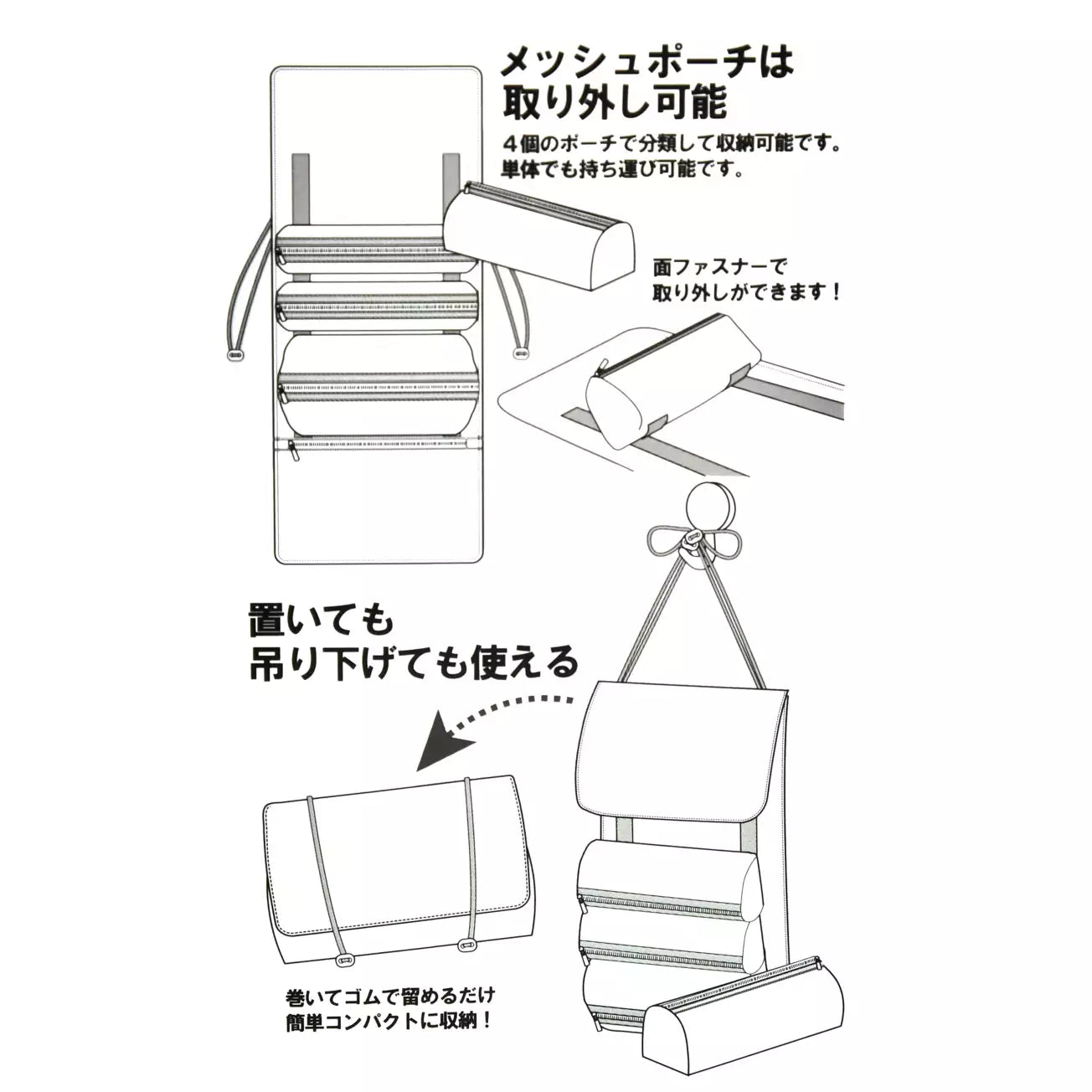 Simply remove the elastic fasteners to reveal a mesh pouch. The mesh pouches come in various sizes: one large and three small. Each pouch has hook-and-loop fasteners, so you can reposition them, remove them, or carry them separately. When you're carrying less luggage, reduce the number of pouches, roll them up, and secure them with the elastic to make them even more compact. The convenient feature is that you can adjust the pouch to fit your needs! You can also hang it on a hook by using the elastic part.