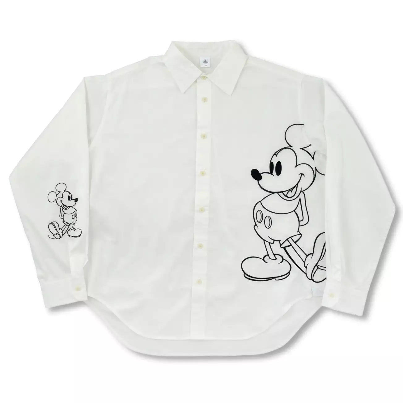 "MAGICAL LABEL" features playful designs based on the concept of "magic in fashion." This white shirt features a Mickey Mouse-focused design. The front features a striking embroidered image of Mickey Mouse standing. Its placement, hanging over the side, creates a relaxed look and accents the sides. The other side's sleeves are the focal point. The character is embroidered in a similar standing pose. The design allows the character to peek out even when the sleeves are rolled up. The oversized silhouette with a round tail makes this versatile piece easy to style. Enjoy creating your own unique look!