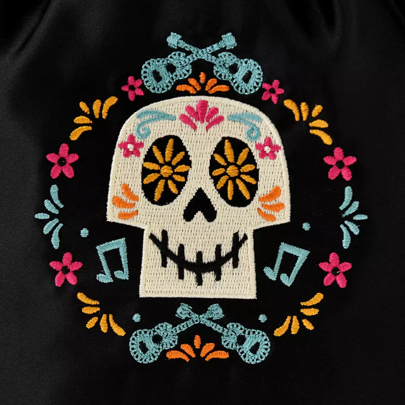 This charm-equipped drawstring pouch from the Disney & Pixar film "Coco," which depicts a colorful world of the dead filled with love and music, is here. The design features a vibrant illustration set against a beautiful, lustrous fabric. The meticulous embroidery adds a touch of elegance to the design. The included charm features a die-cut design of a guitar, a key element of the film. The ball chain allows for easy attachment and detachment.