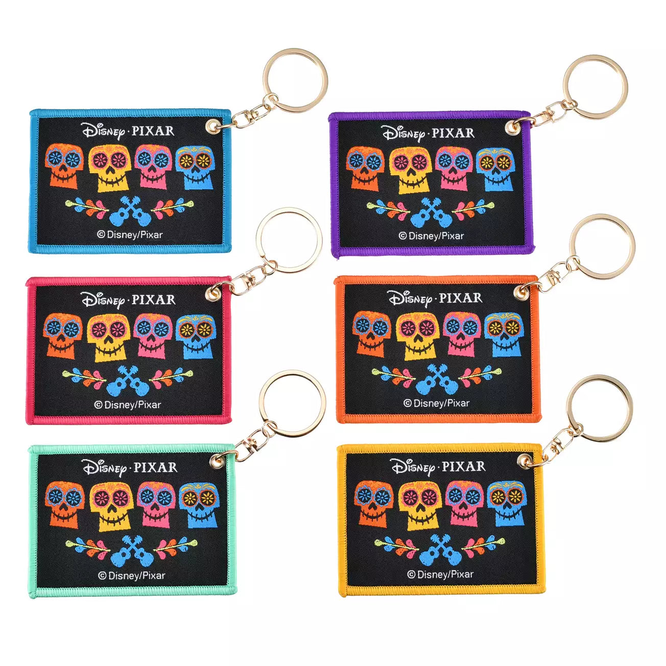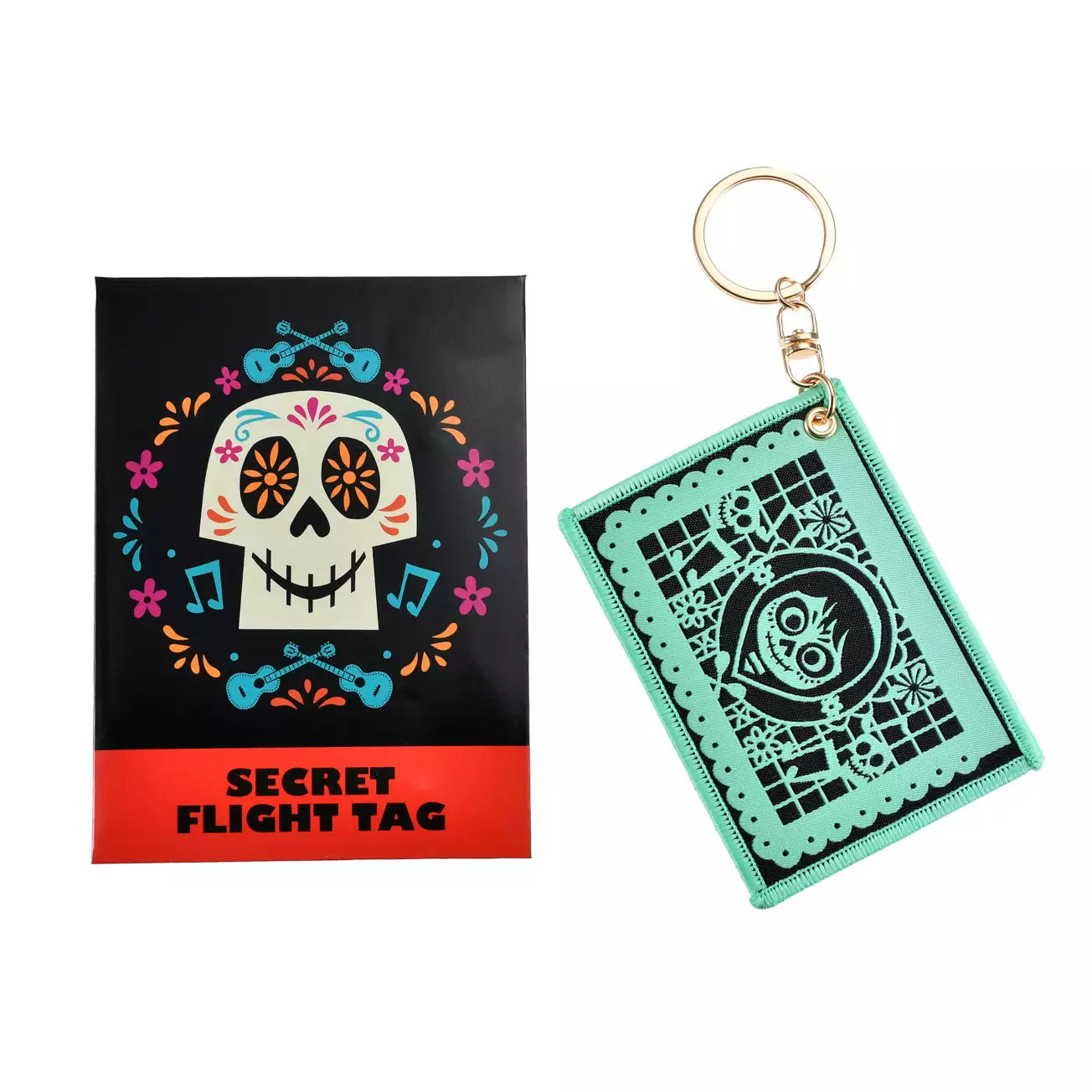 From the Disney & Pixar film "Coco," a colorful world of the dead filled with love and music, comes a secret keychain. This double-sided flight tag features a traditional Mexican paper-cutting motif called papel picado. There are six different designs: green, blue, pink, purple, yellow, and orange. Some designs feature Miguel, Hector, Dante, and Ernesto de la Cruz.