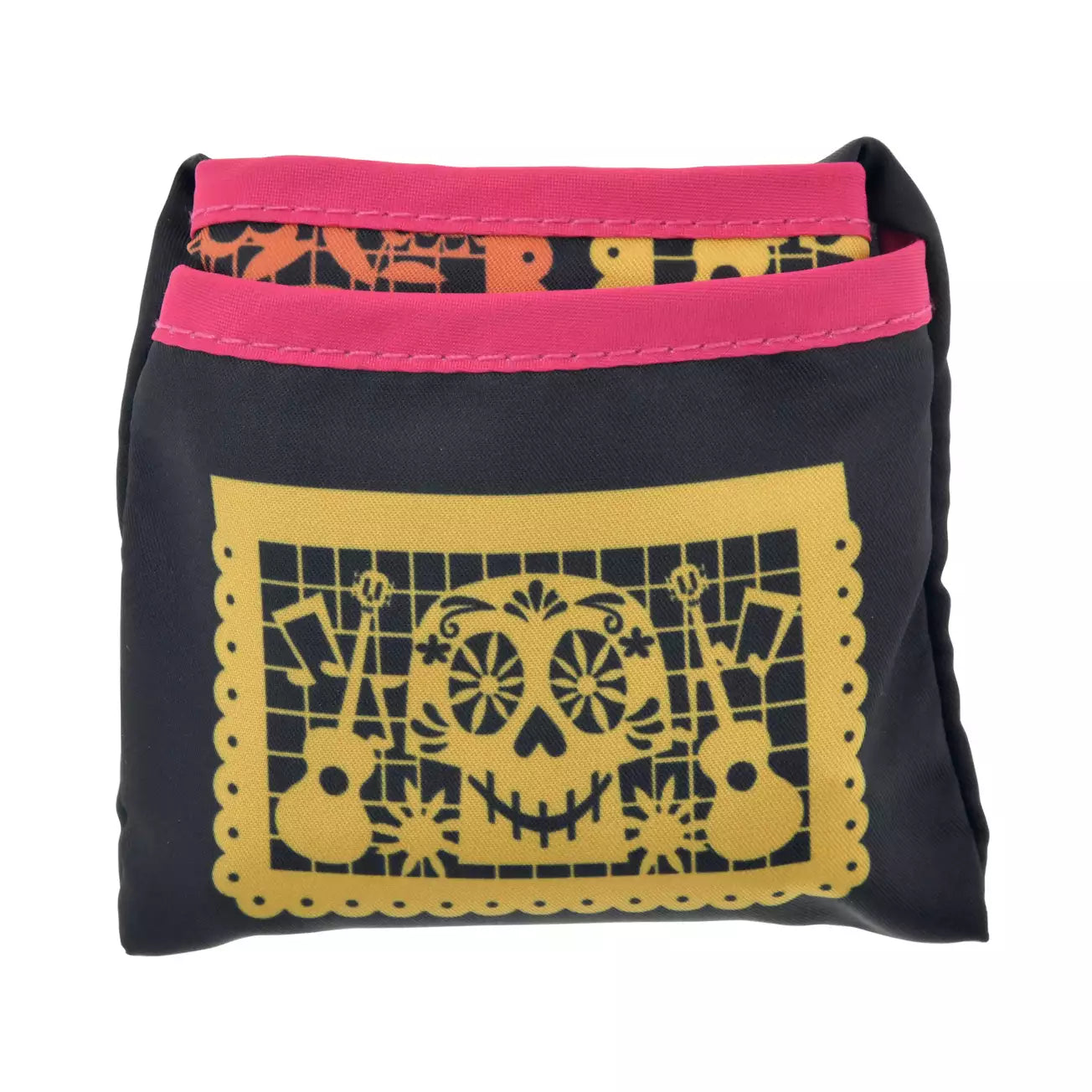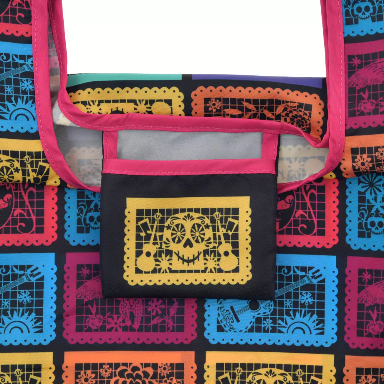 Introducing an eco-bag from the Disney & Pixar film "Coco," which depicts a colorful world of the dead, filled with love and music. The bag features traditional Mexican paper cutting, papel picado, as its motif. The beautifully arranged, colorful illustrations feature characters Miguel, Hector, Dante, Ernesto de la Cruz, and Pepita! This small eco-bag is convenient to have on hand. It folds up for easy portability. Perfect for everyday use!