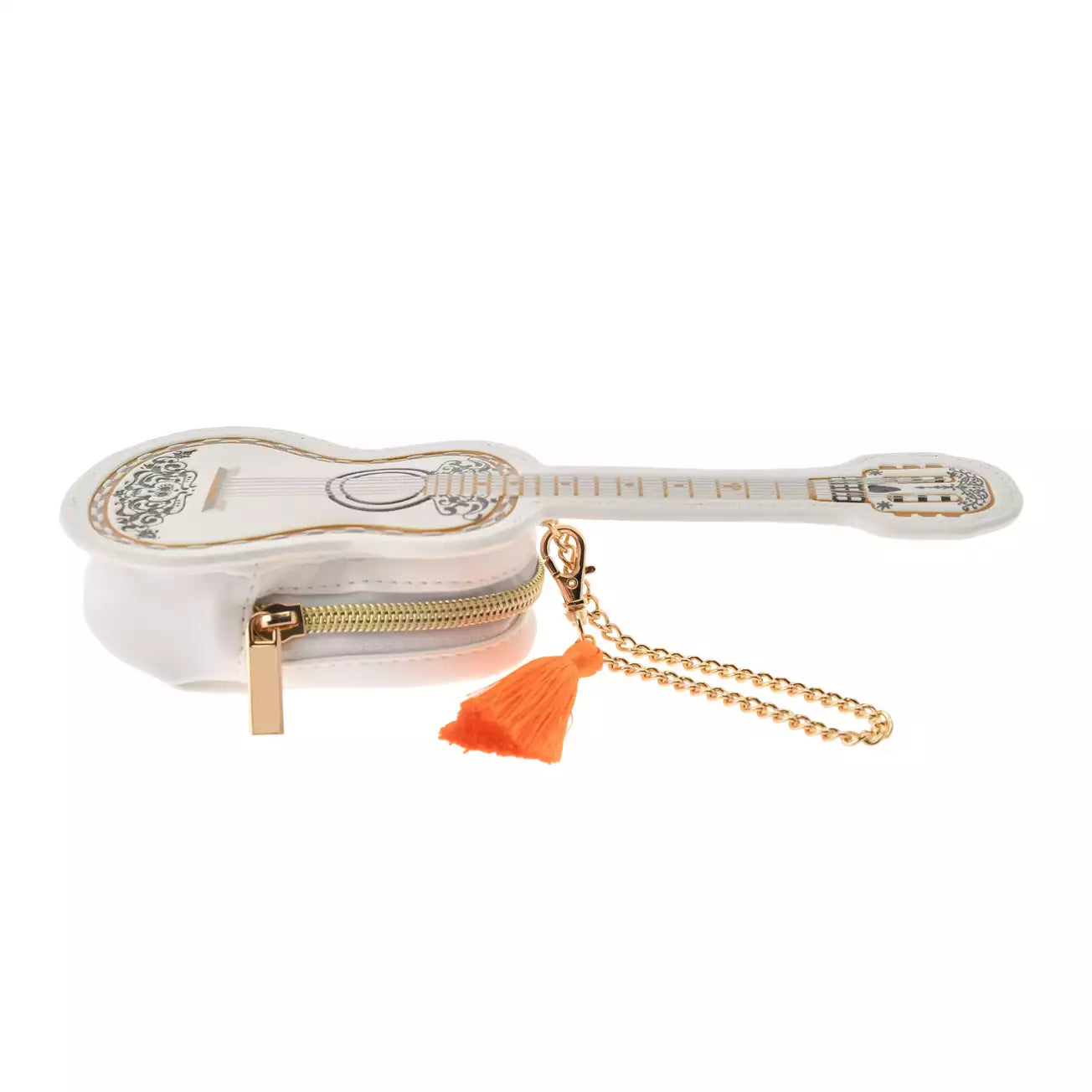 Introducing a guitar-shaped pouch from the Disney & Pixar film "Coco," which depicts a colorful world of the dead, filled with love and music. This pouch features the key element of the film, a white guitar, recreated with embossing and printing. The body of the guitar serves as storage. The vertical compartment is ideal for carrying lipstick, allowing for easy access. The interior features an all-over print fabric, featuring colorful illustrations characteristic of the film scattered across a black background.