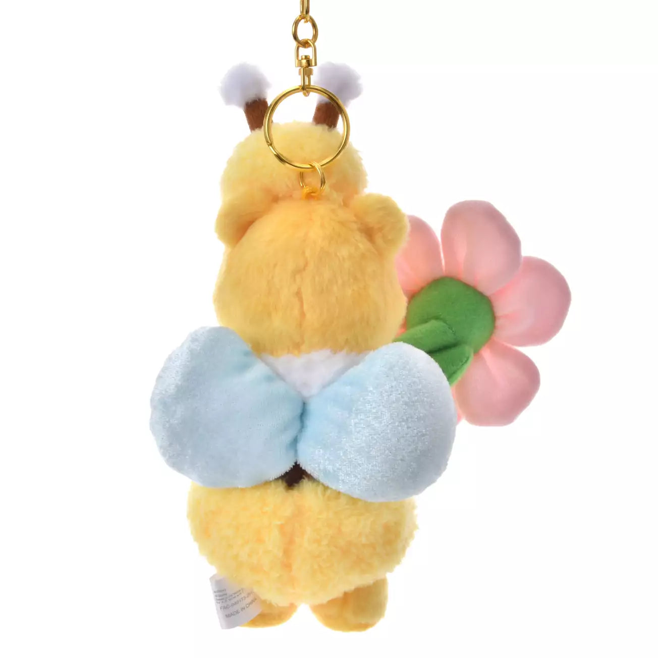 This year, a design with a flower motif has been released as part of a series related to Honey Day. A Winnie the Pooh stuffed animal keychain from "Flower Garden". Winnie the Pooh looks great in his fluffy bee costume. The pompom decorations on his antennae and light blue wings are cute. He has a pink flower in his hand. The flower he is holding with both hands has a wire in the stem so you can change the angle to your liking.