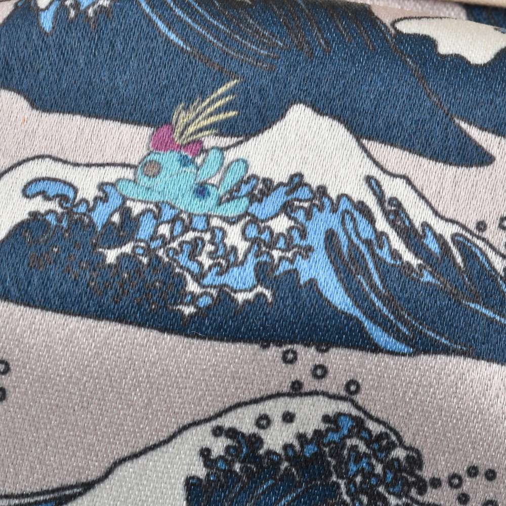 e-inspired design, paired with a tassel-adorned haori and hakama for a stylish look. The kimono's color scheme is used to create a chic outfit, and the adorable tail poking out from the hakama's back is a delight to look at. Find the scrump being swept away by the waves in the lining of the kimono and haori!