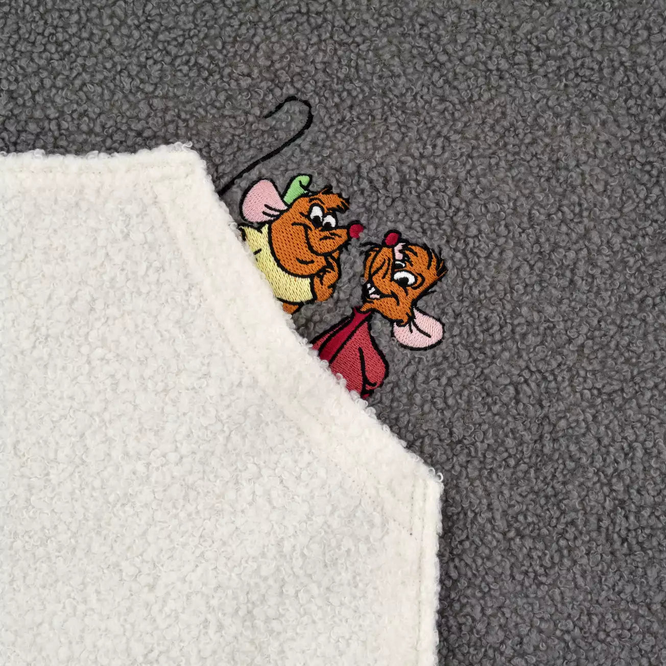 Featuring embroidered Jack and Gus. This fluffy long-sleeved hoodie features a Lucifer design. Made with a curly, looped boa fabric, the hood features a character face design that makes you look like Lucifer. Check out the front pocket, too. The mouse characters Jack and Gus peek out! The cute, fluffy outer fabric has a soft feel. The unbrushed lining makes the sleeves easy to slip on and lightweight for a comfortable fit. Enjoy fun time in this playful loungewear.