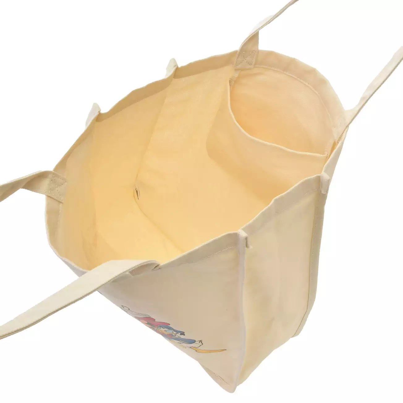 A classic tote bag with character illustrations and logos printed on it. The colorful art stands out against the natural color of the bag.