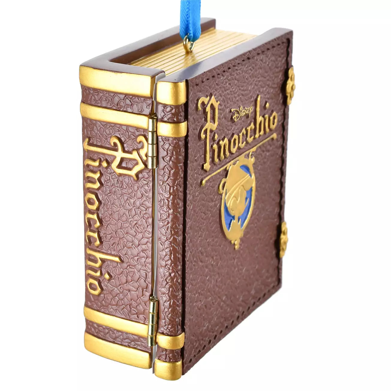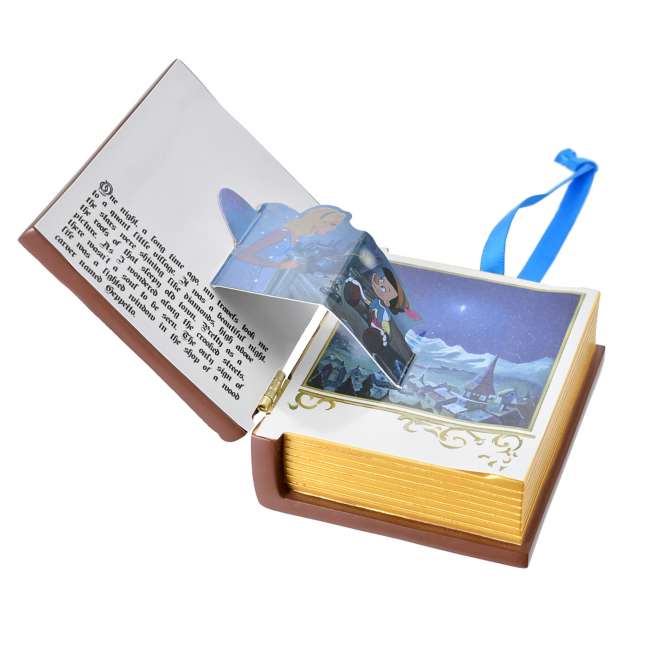 Introducing this storybook ornament from "Pinocchio." Its luxurious, gold-lettered, leather-bound design features a gorgeous, illustrated page. Open the cover to reveal beautifully illustrated pages, featuring music and a reading of the opening lines of "Pinocchio" in English. The unique pop-ups featuring Pinocchio, Jiminy Cricket, and the Blue Fairy create a pop-up book-like experience. Hang it up to immerse yourself in the world of the work. Enjoy the meticulous details in 360 degrees.