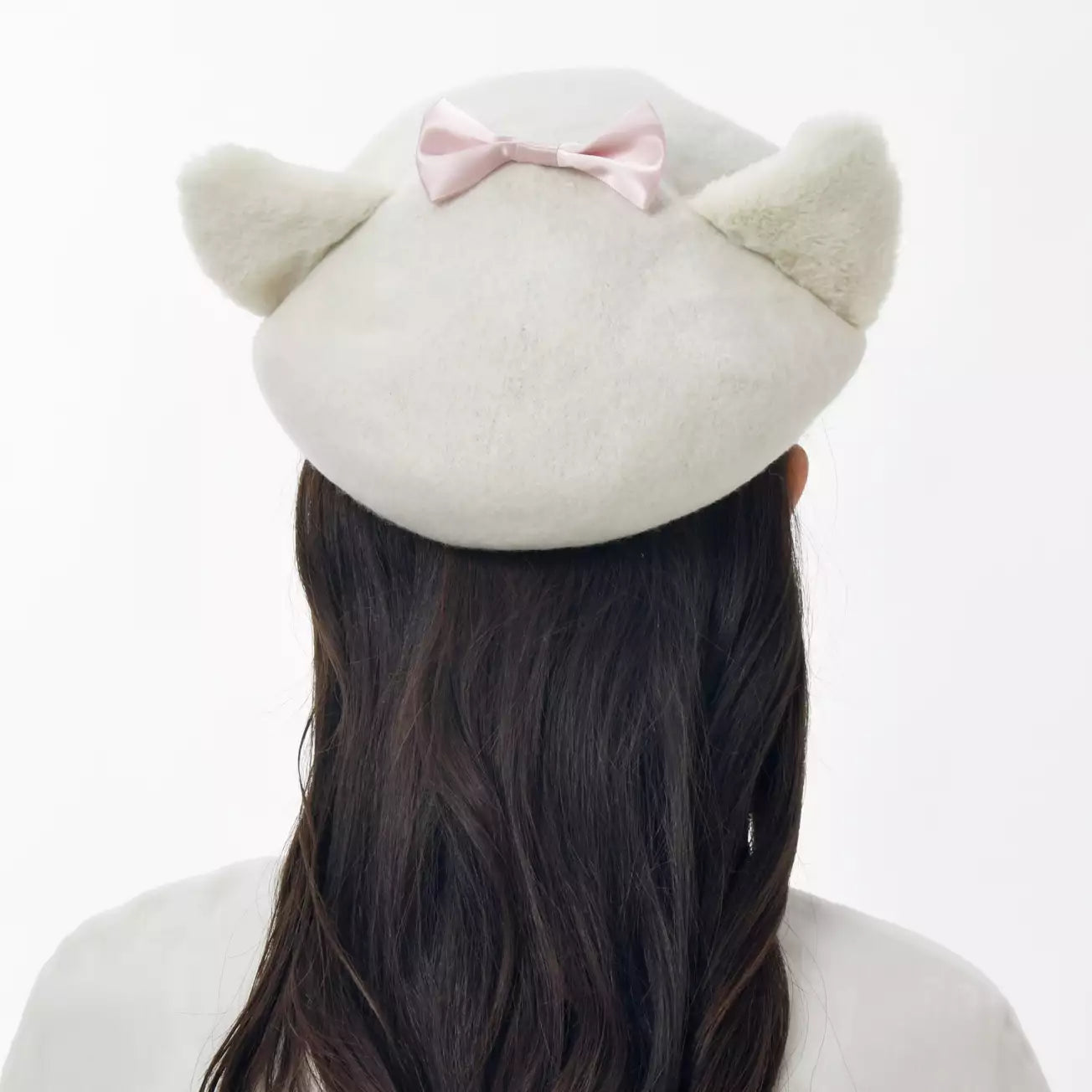 Introducing a beret with a Marie motif from "The Aristocats." This white beret has a subdued impression. The ears that pop out are just like Marie the kitten! The pink ribbon that matches the character adds an accent to the design. This playful character design hat makes a big impact. It's perfect for outings to events, theme parks, and more.