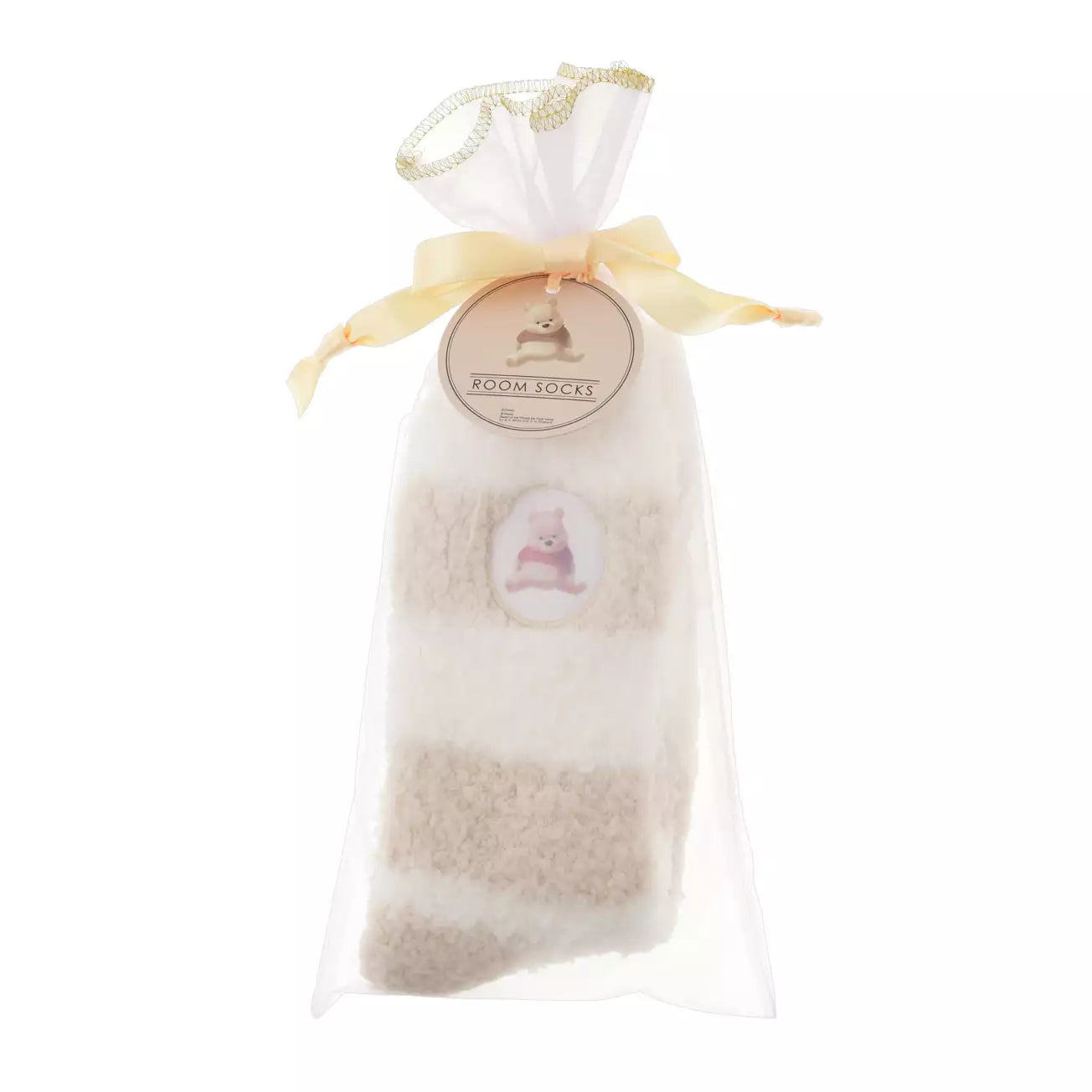 Popular Disney characters are now available as plush toy art. These fluffy striped room socks feature Winnie the Pooh. The heartwarming and adorable character is transformed into adorable plush-style art. The Winnie the Pooh print is added to a warm beige and soft milky striped pattern. The slightly puffy appliqué conveys the softness of a plush toy, and the adorable art of the floppy pose is adorable. Not only is the design soothing, but the comfortable thickness and warmth of the fluffy material make it perfect for relaxation. The soles also have non-slip pads. It comes in an organza drawstring bag, making it a perfect gift.