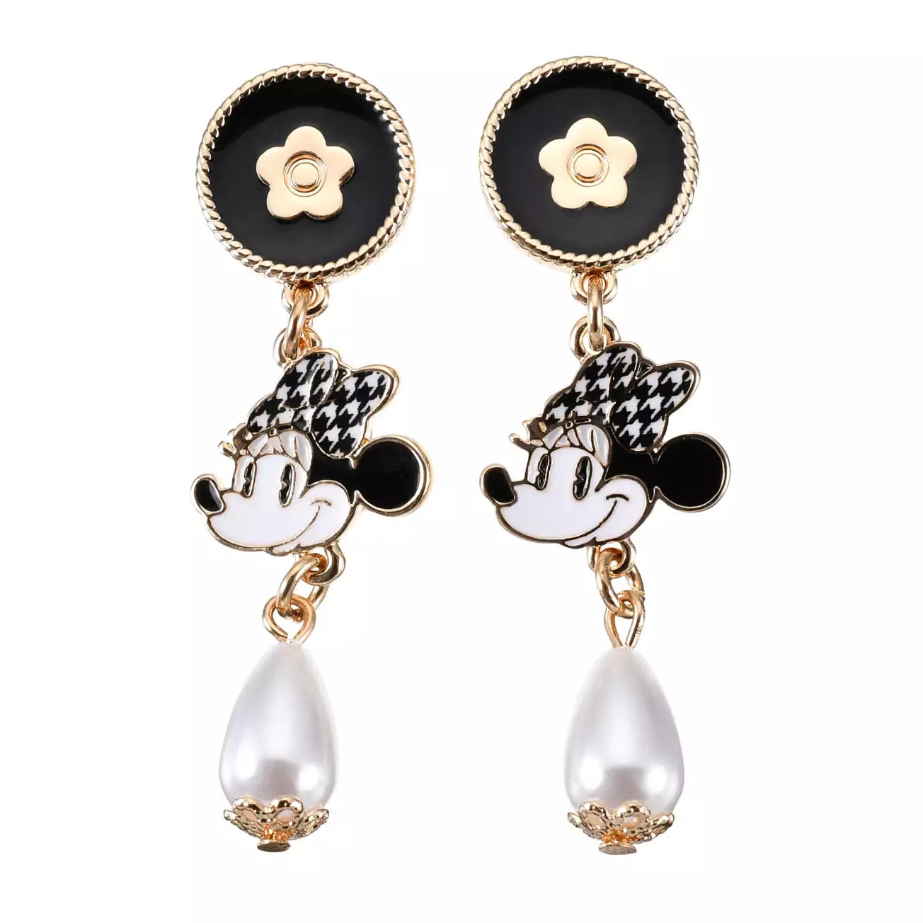 This is a collaborative project with MARY QUANT. Introducing these adorable earrings from the Minnie design fall/winter collection. The design features a circle with the brand's signature daisy motif in the center, Minnie's face wearing a houndstooth ribbon, and a swing design with a string of drop pearls. The smooth, elegant luster of the pearl beads adds a touch of glamour. The swaying design creates a flattering effect around the face.