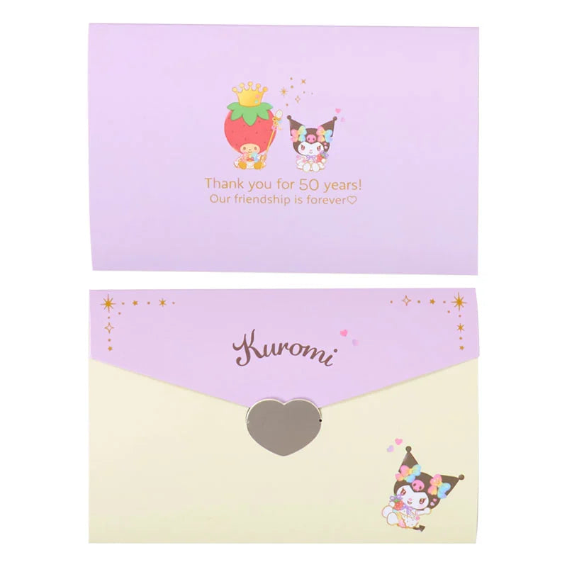 Dressed up in a rainbow ribbon and holding a strawberry, Kuromi is full of celebratory charm★ A special set that includes a plush toy, birthday hat, message card, and background sheet♪
