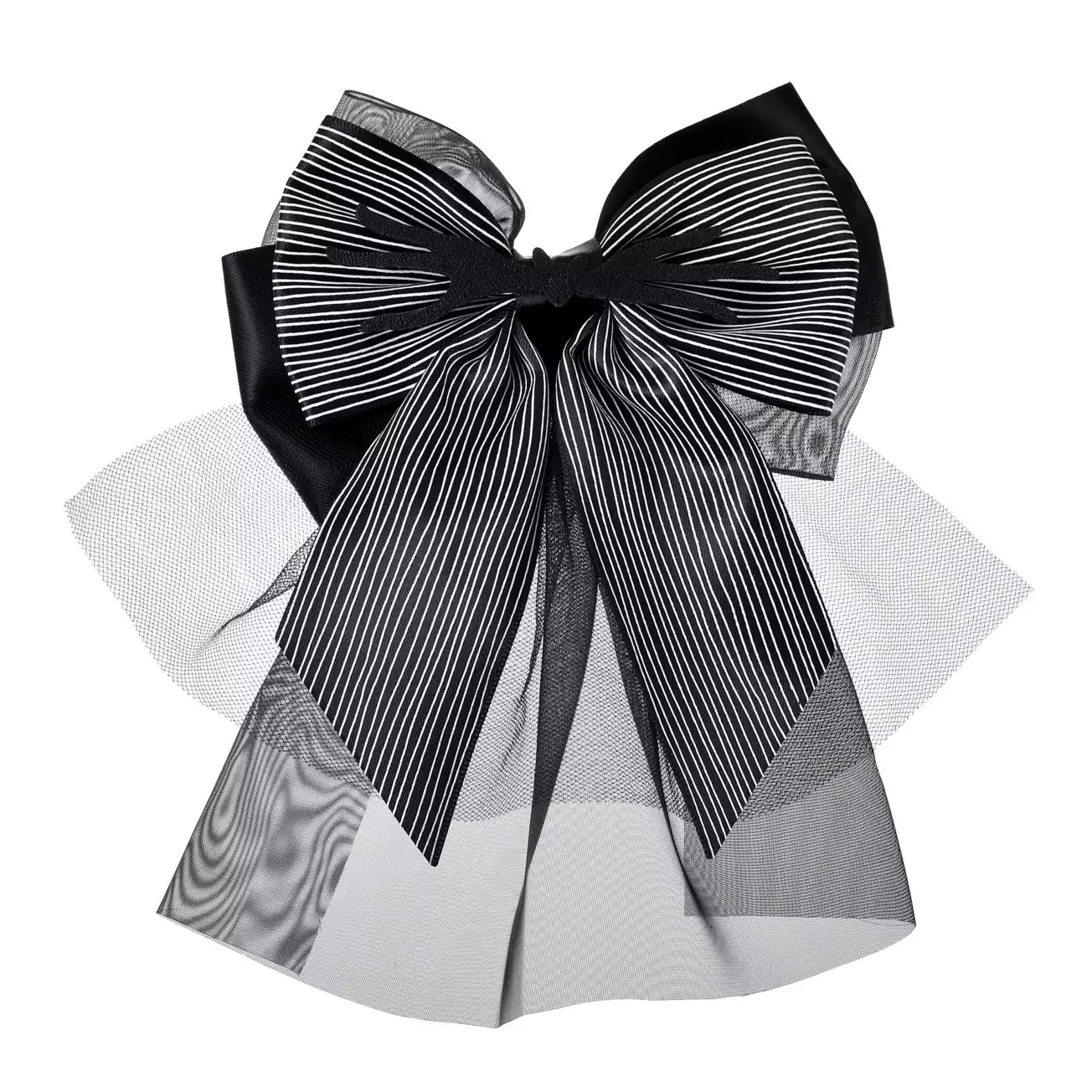 Introducing a Jack Skellington-inspired hair clip with a badge from "Tim Burton's The Nightmare Before Christmas." This triple-ribbon hair clip is packed with character-like style. The gorgeous design features a leather-like bat motif resembling the bow tie worn by Jack Skellington, layered with a striped ribbon, black satin ribbon, and sheer ribbon, matching the character's costume. The voluminous hair clip makes a statement, making it perfect for outings to events, theme parks, and more. It can also be used as a badge or as an accent piece for your bag!