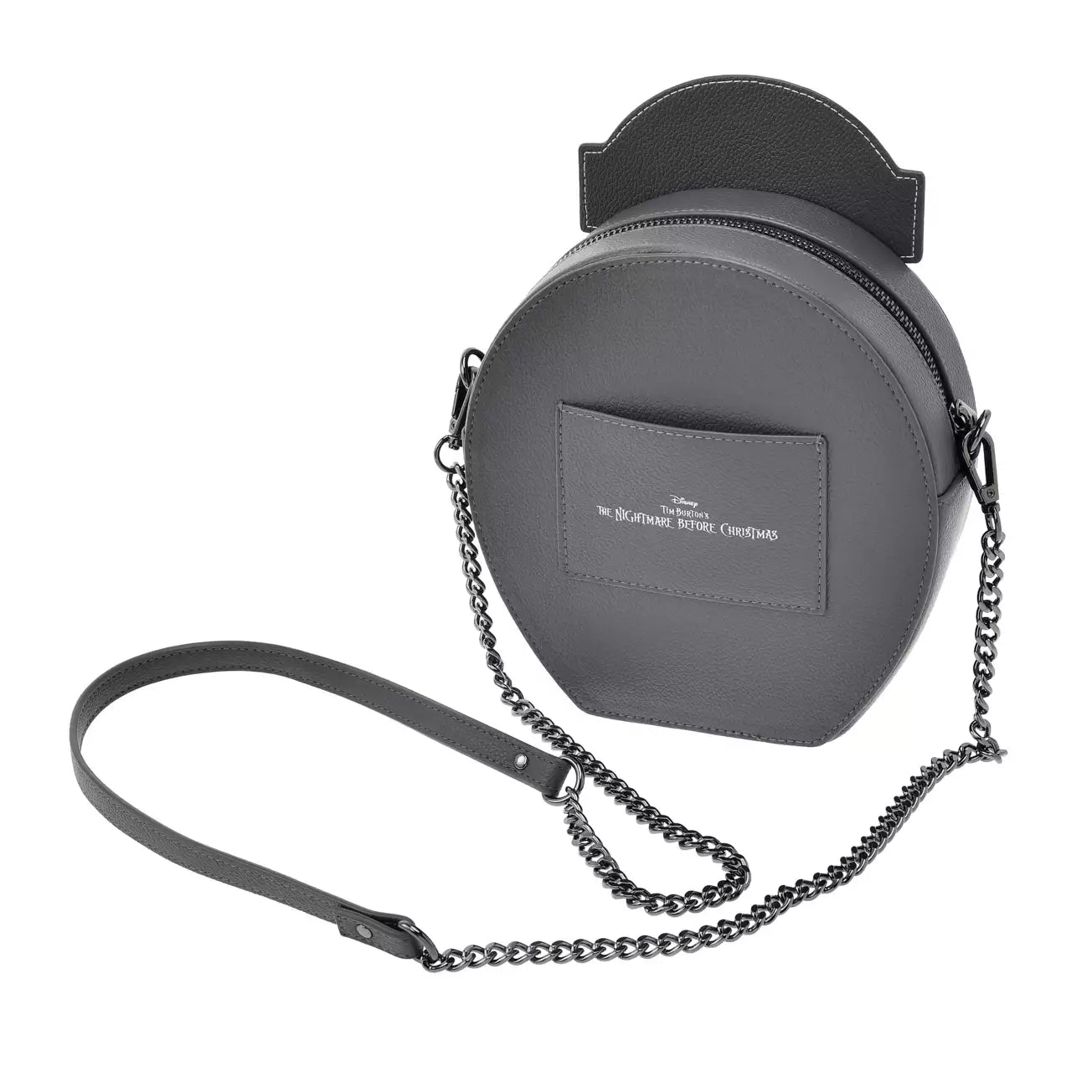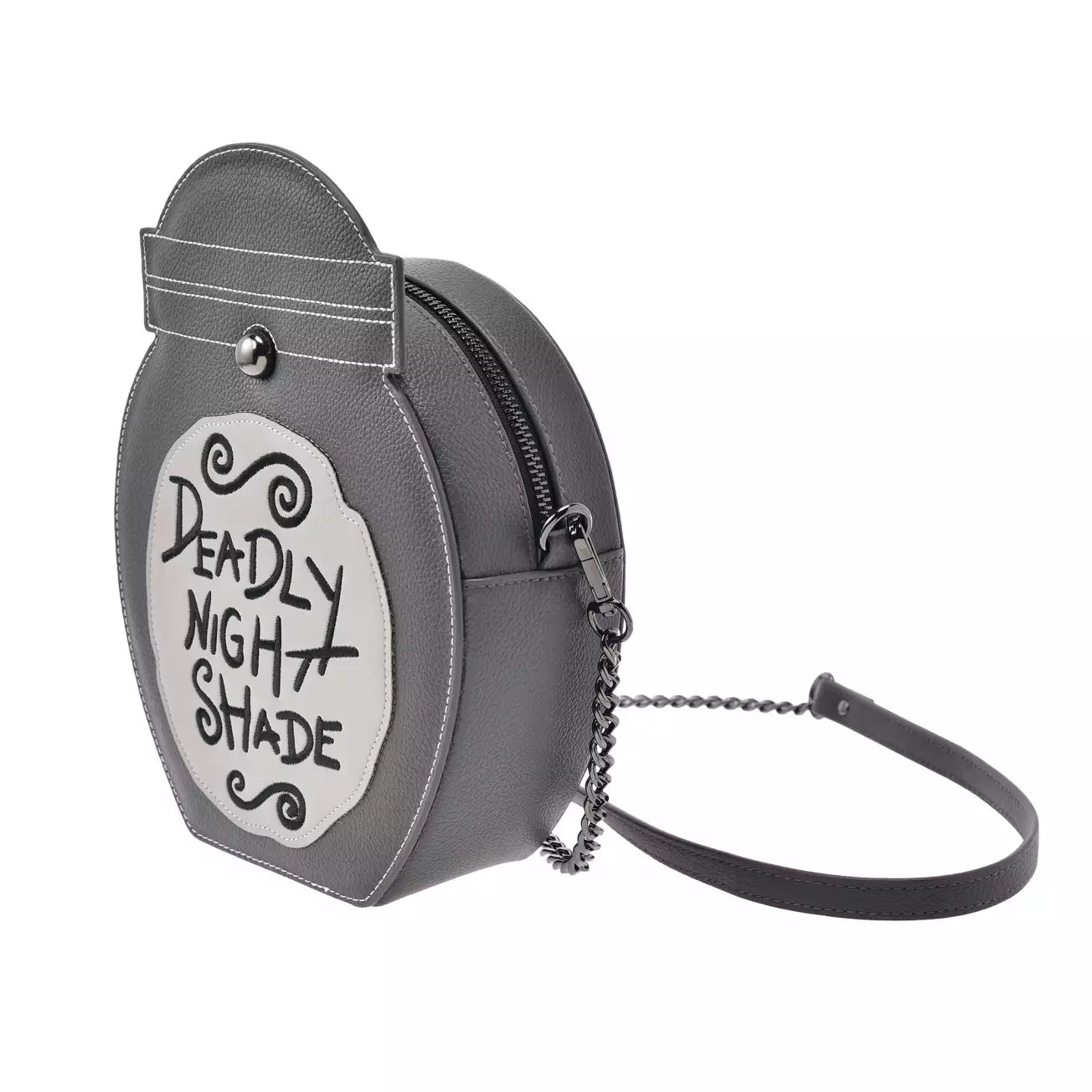 This shoulder bag from "Tim Burton's The Nightmare Before Christmas" features a nightshade jar motif. It's inspired by the nightshade jar Sally puts in the soup she makes for Dr. Finklestein. The design is inspired by the jar itself. The front features a die-cut design, resembling the jar itself, with patchwork and embroidery for added detail. The bag's sleek, rounded compartment adds a touch of style, maintaining the jar's aesthetic while maintaining its practicality. The exterior features a patch pocket printed with the film's logo.