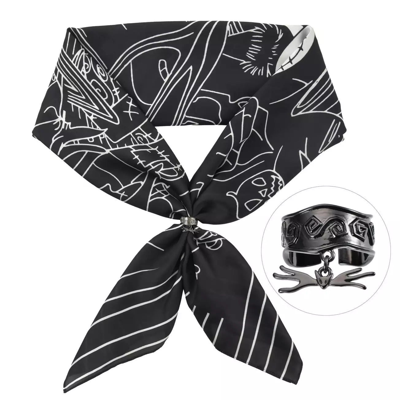 This scarf and ring set features designs from Tim Burton's The Nightmare Before Christmas. The luxurious design centers around Jack Skellington, featuring Halloween Town residents like Zero, Sally, the Black Cat, the Mayor, Oogie Boogie and his minions Lock, Shock, and Barrel, Dr. Finklestein, Vampire Teddy, and even Santa Claus. A