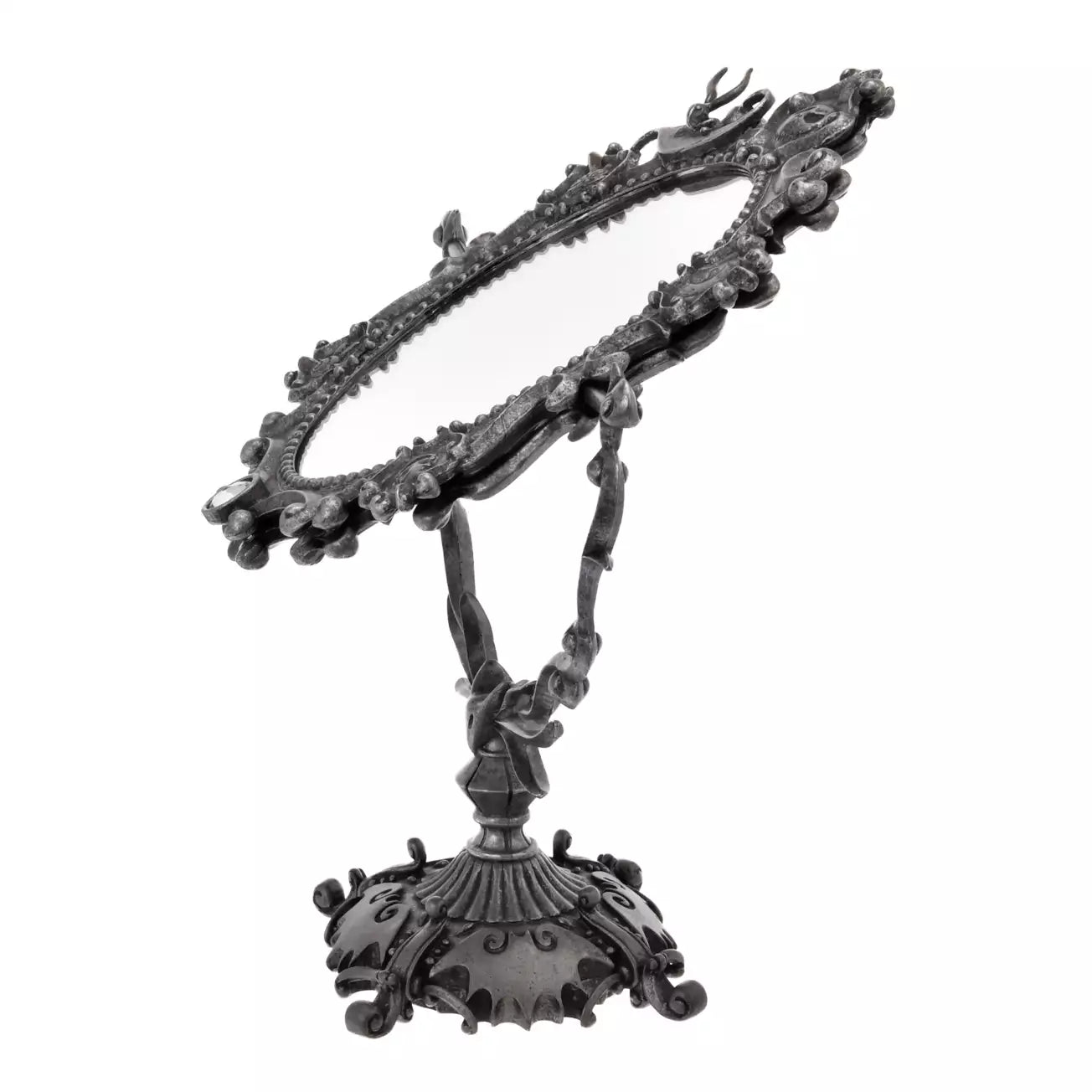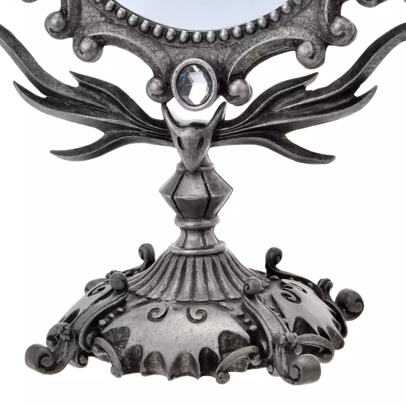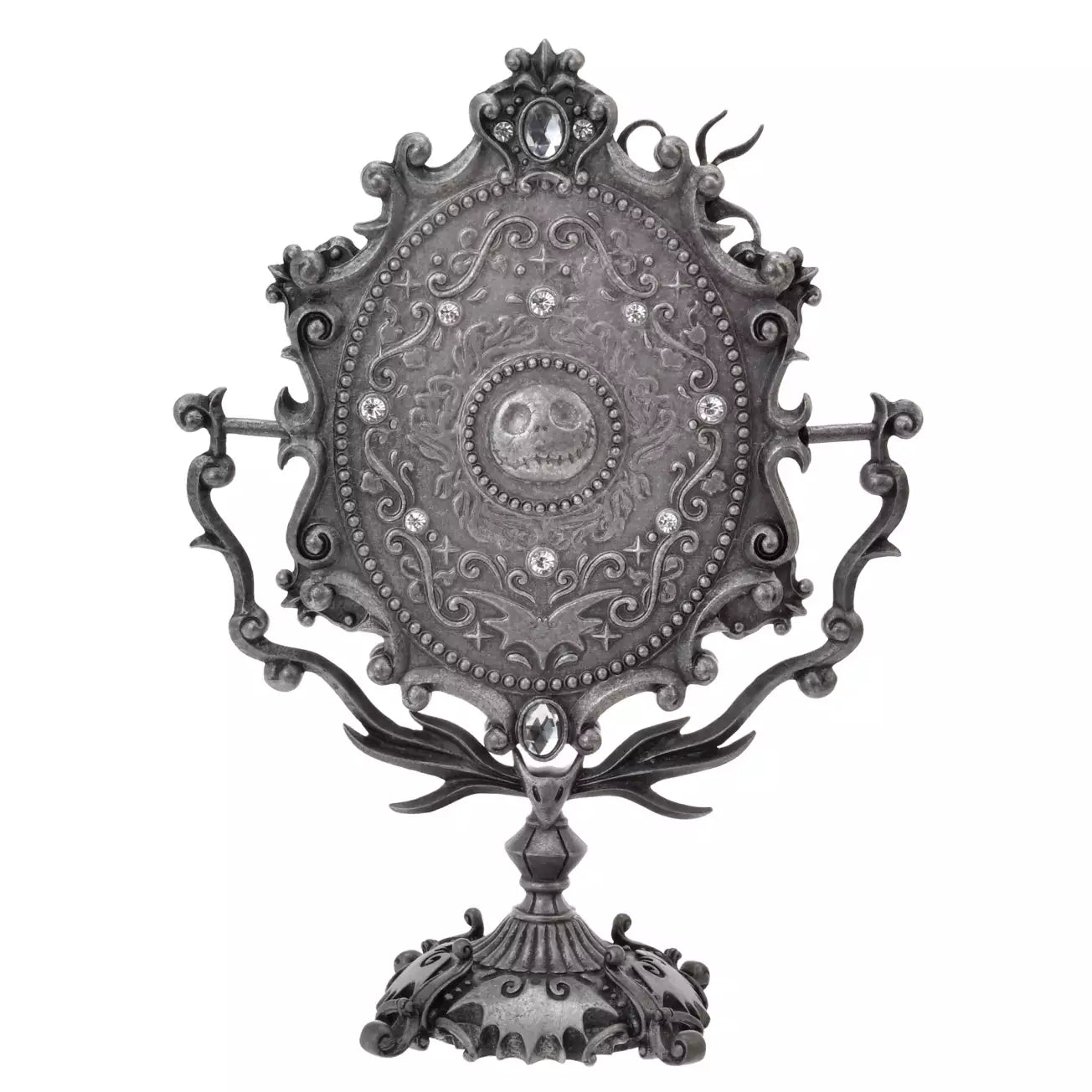 Bring the unique world of Tim Burton's The Nightmare Before Christmas to your home with a sophisticated atmosphere. This stand mirror features an antique texture and a chic sparkle. The mirror features a dignified and luxurious design, with reliefs of Jack Skellington, Zero, Sally, Vampire Teddy, Killer Duck, and Oogie Boogie surrounding the mirror. The back of the mirror is centered around Jack Skellington's face, and is adorned with botanical-inspired ornaments and sparkling stones! The stand also exudes a touch of the film. A bat motif, reminiscent of Jack Skellington's bow tie, supports the mirror, while the base features a cat's foot design.