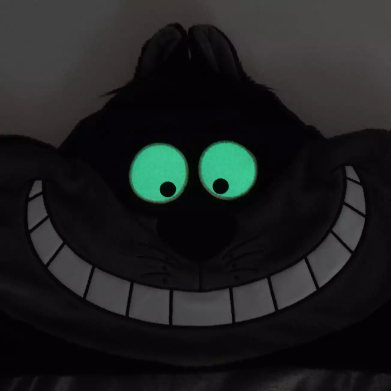 The hood and blanket surface feature a monochrome Cheshire Cat motif, depicting the cat disappearing into the darkness. The hood's eyes are made of glow-in-the-dark material, which stores light in bright places and glows in the dark! The black and gray fabric is very lustrous. The classic colors have a strong sheen, creating a striking finish.