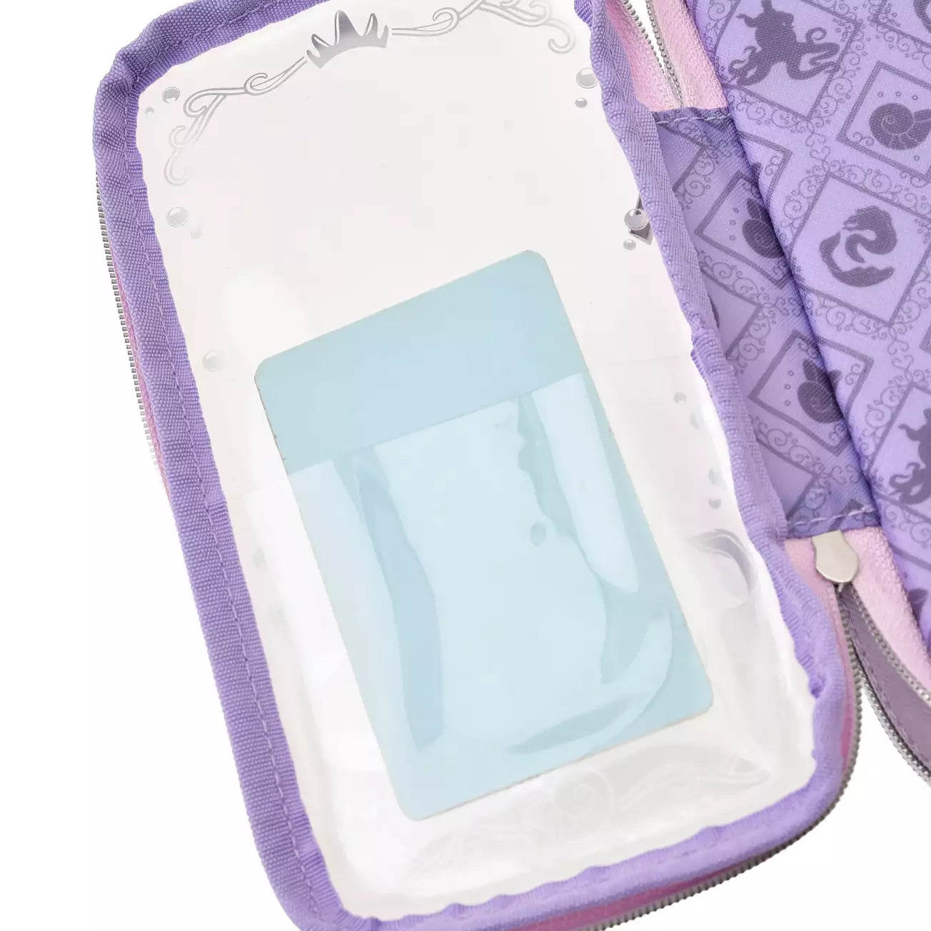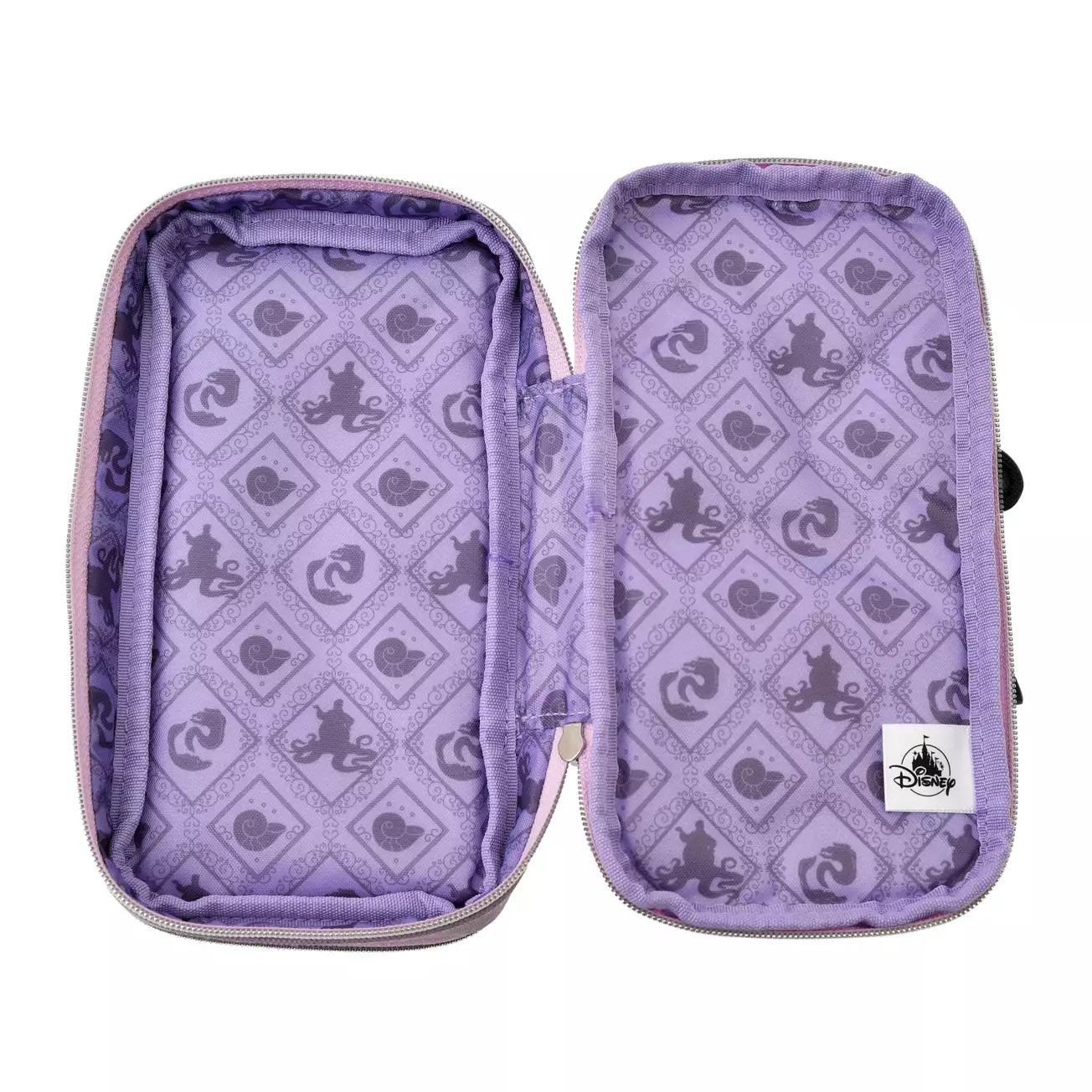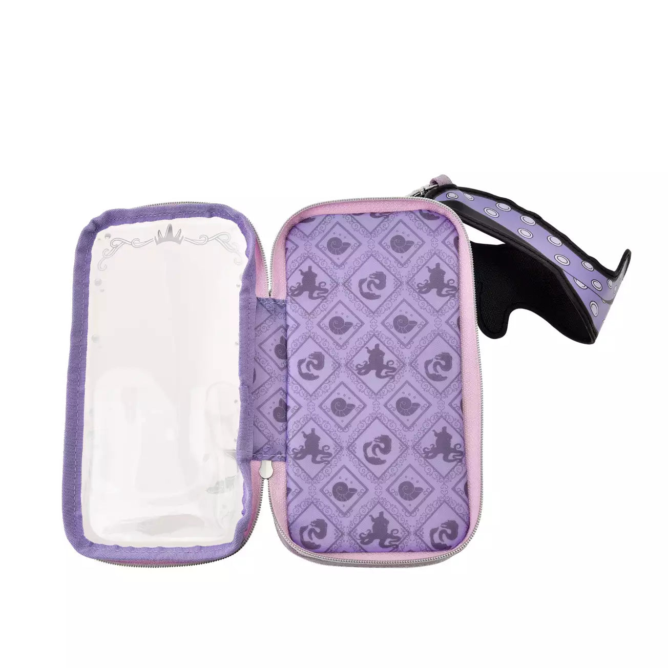 This two-compartment pouch, inspired by Disney villains from "The Little Mermaid," features a clear window that lets you see your favorite items from the outside. This leather-look pouch features a zippered storage compartment. One side features a silver logo and the other side features a clear front, allowing you to enjoy displaying your items. The clear side features motifs related to Ursula and her minions, Flotsam and Jetsam, creating a decorative frame for your items. The interior clear pocket is convenient for storing acrylic stands and other items. This pocket prevents items from shifting or moving around while carrying the pouch!