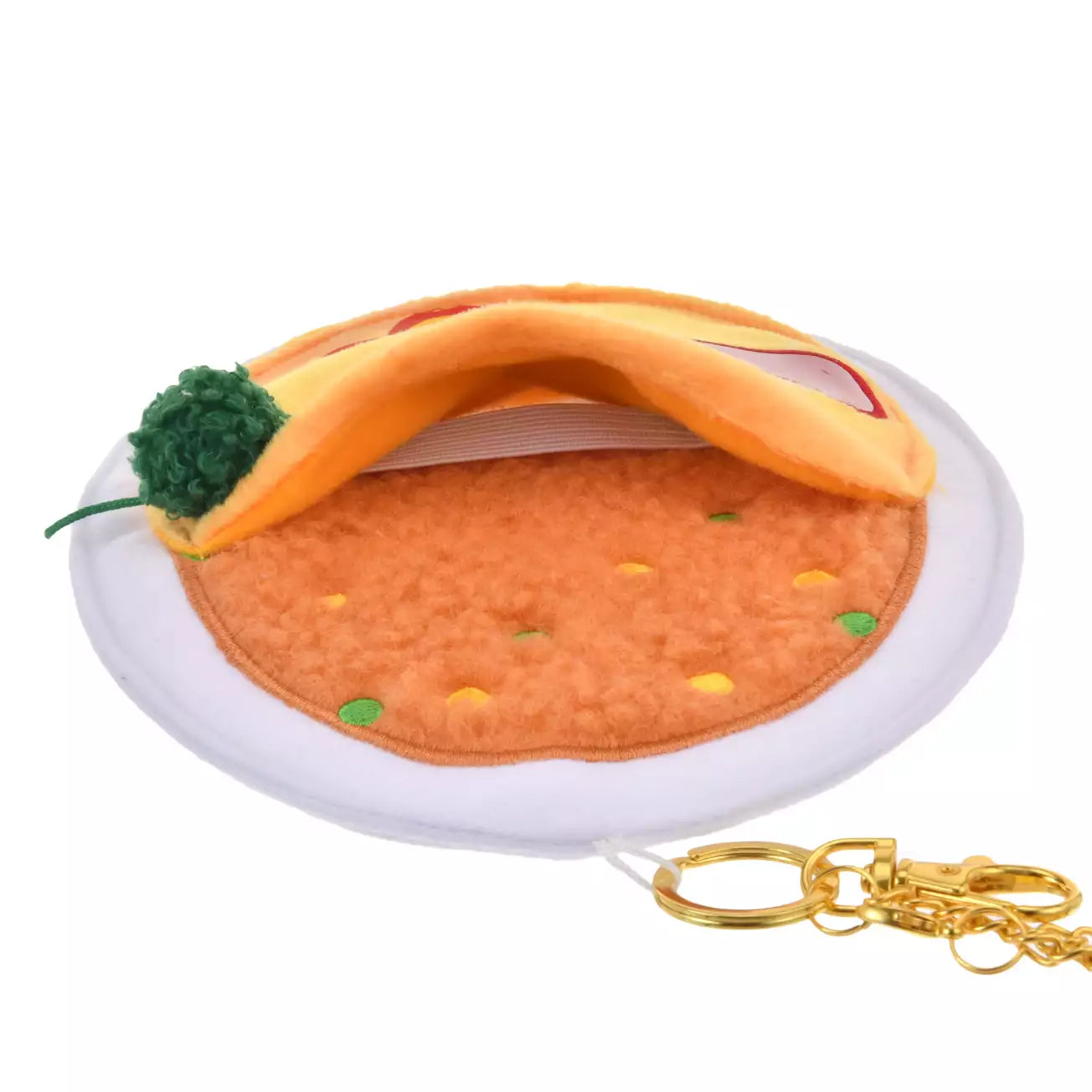Introducing a keychain with a pocket that can be used as a plush pouch featuring a Mickey Mouse omelet design. This delicious-looking omelet features a Mickey Mouse icon. The pocket is located between the egg and rice, and an approximately 8.5cm elastic band inside the pocket can secure your plush toy. You'll be delighted to see your favorite plush toy or plush keychain slip into this uniquely Disney hoodie!